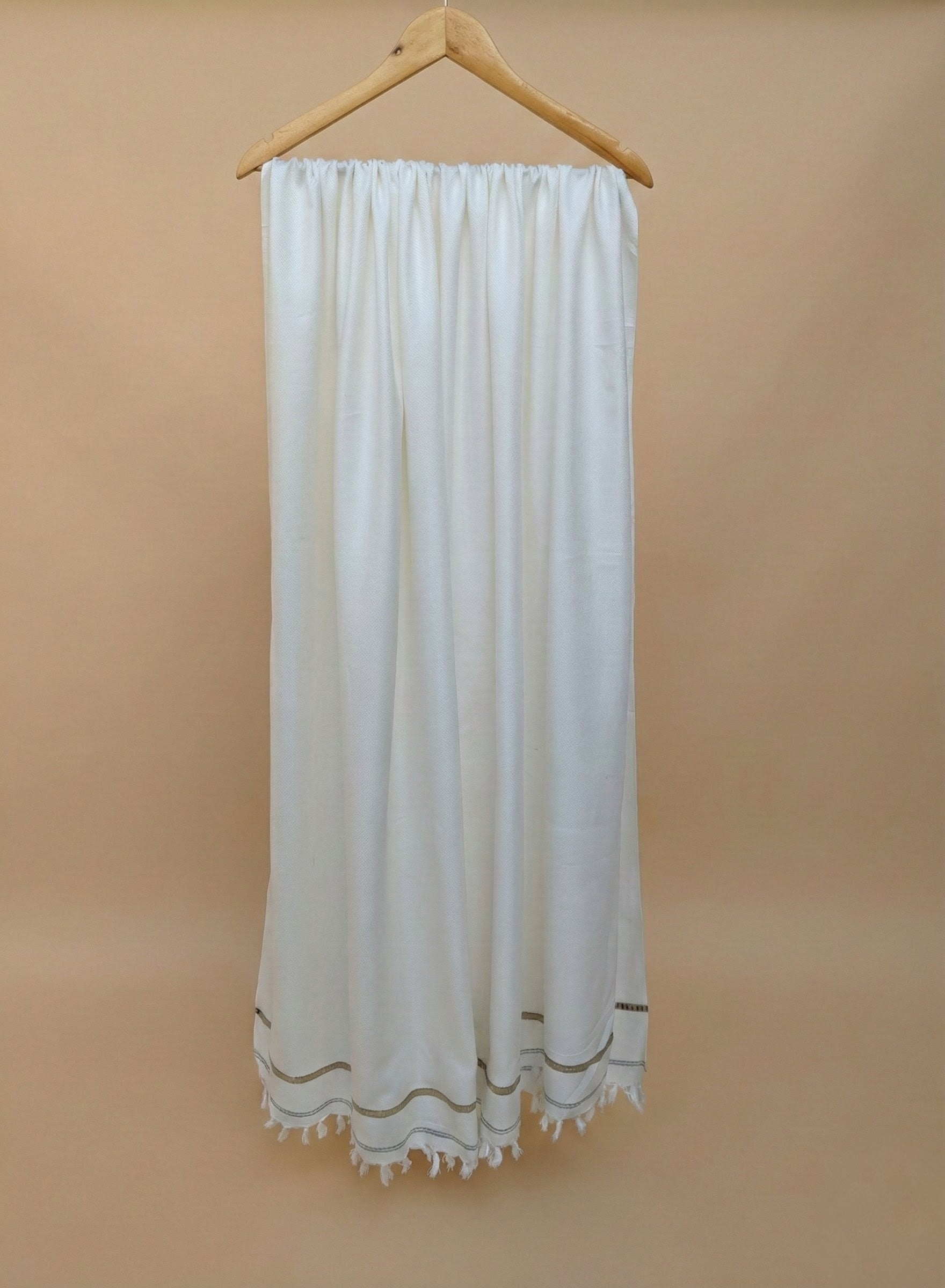 Featuring a sophisticated, minimalist design, the shawl is accented with subtle horizontal contrast stripes near the hem, adding a touch of modern definition to a classic look. Finished with delicate, hand-twisted fringes, this piece drapes beautifully over the shoulders, adding grace to any outfit.