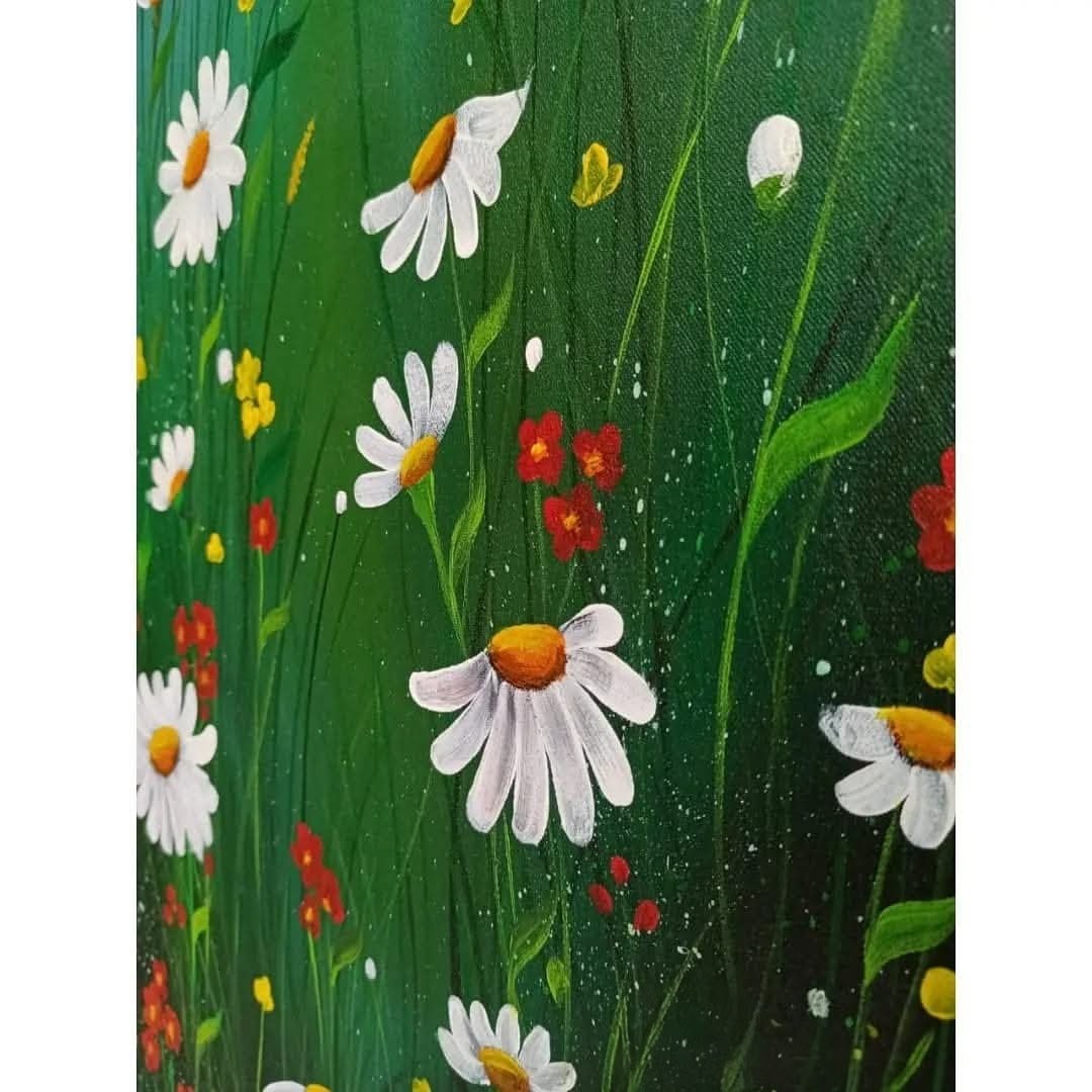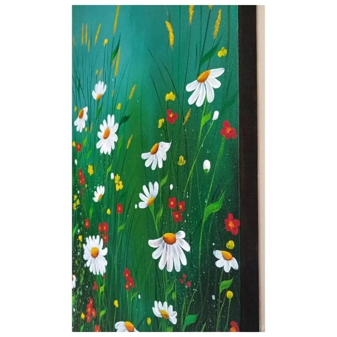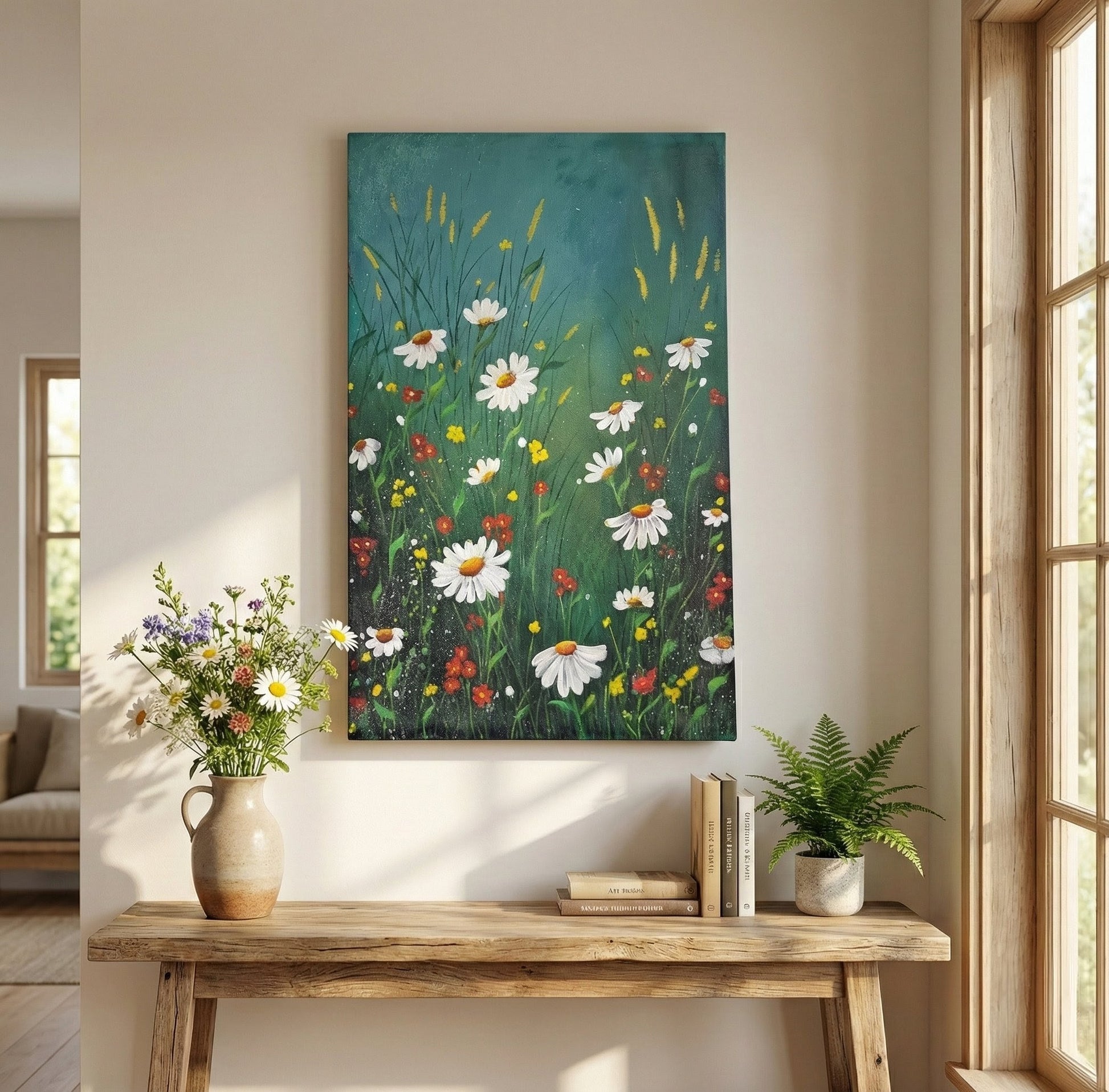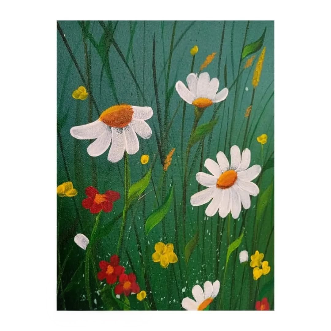This artwork captures the free flowing beauty of nature, celebrating the simplicity of wildflowers dancing in the breeze. The vibrant greens and delicate petals represent freshness, renewal, and the peaceful harmony found in untouched meadows. The design embraces spontaneity showing that beauty lives in natural, imperfect, and unplanned spaces.