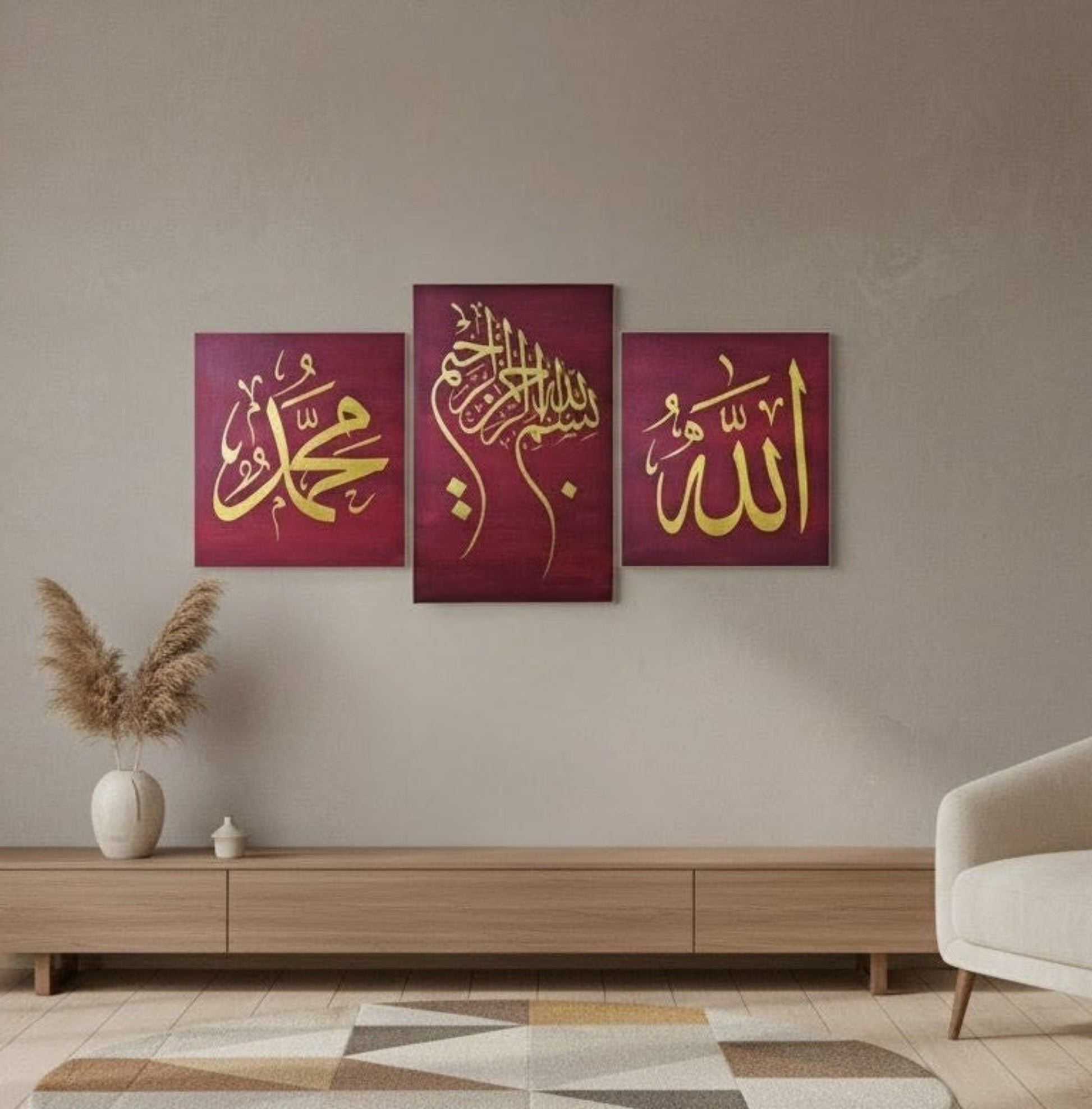 This 3 piece canvas set is designed as a journey of faith each panel carrying its own spiritual voice while completing a single, harmonious story. The deep maroon backdrop symbolizes tranquility and grounding, while the golden calligraphy rises from it like light breaking through stillness. Together, the words Allah, Muhammad ﷺ, and Bismillah form a circle of remembrance that gently transforms any room into a place of peace, guidance, and barakah. The modern spacing and bold simplicity give it a contemporary feel, making it perfect for homes that want spirituality wrapped in elegant, minimal art.