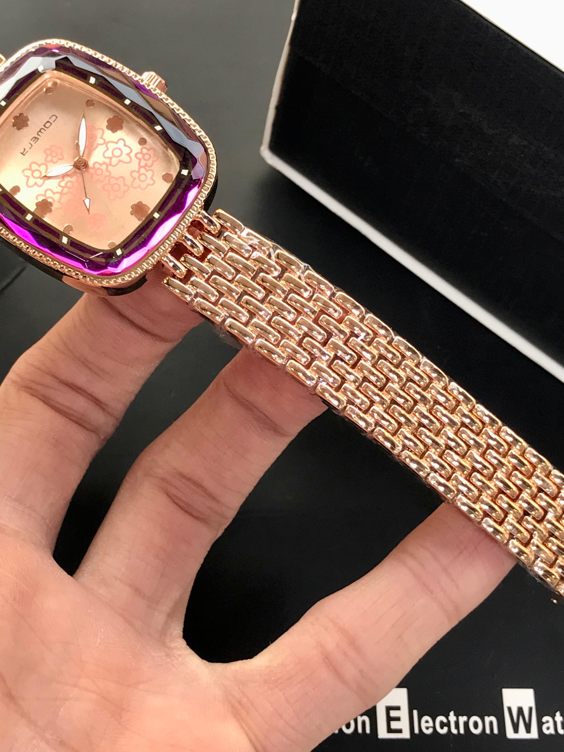 This watch blends elegance with a modern feminine touch. The square-cut dial, framed with a jewel-like purple edge, gives it a unique premium look that instantly stands out. The floral patterns inside the dial add softness and grace, creating a perfect balance between style and delicacy. Designed for women who love subtle luxury, this piece adds a refined sparkle to everyday outfits and evening wear alike.